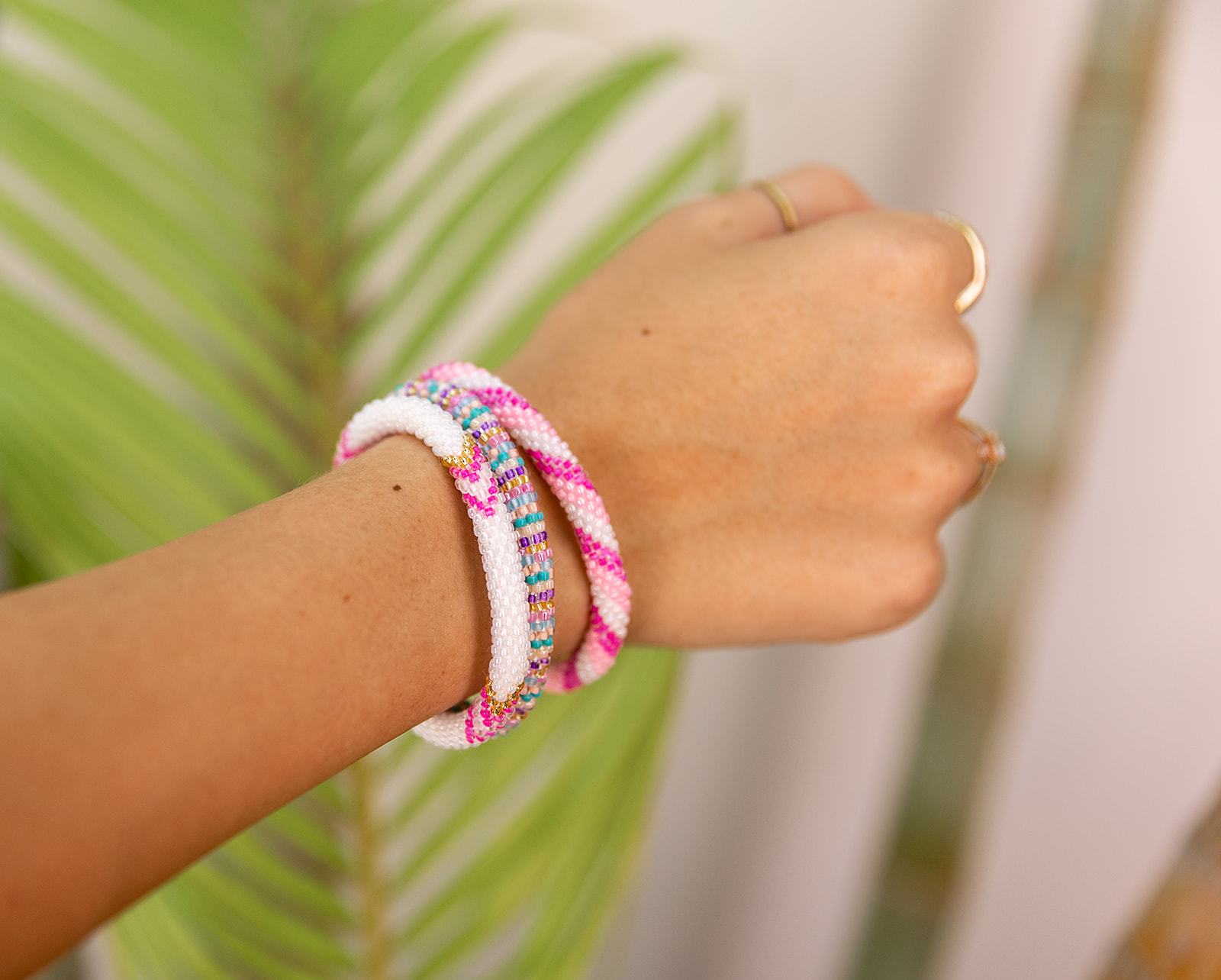 This Sashka Co. glass beaded bracelet was hand-crocheted by skilled artisans in the Kathmandu Valley of Nepal. It features pink, white, and gold glass beads in an arrow pattern. Sashka Co. Bracelets make amazing friendship bracelets and support fair trade, helping women in Nepal rise above poverty.